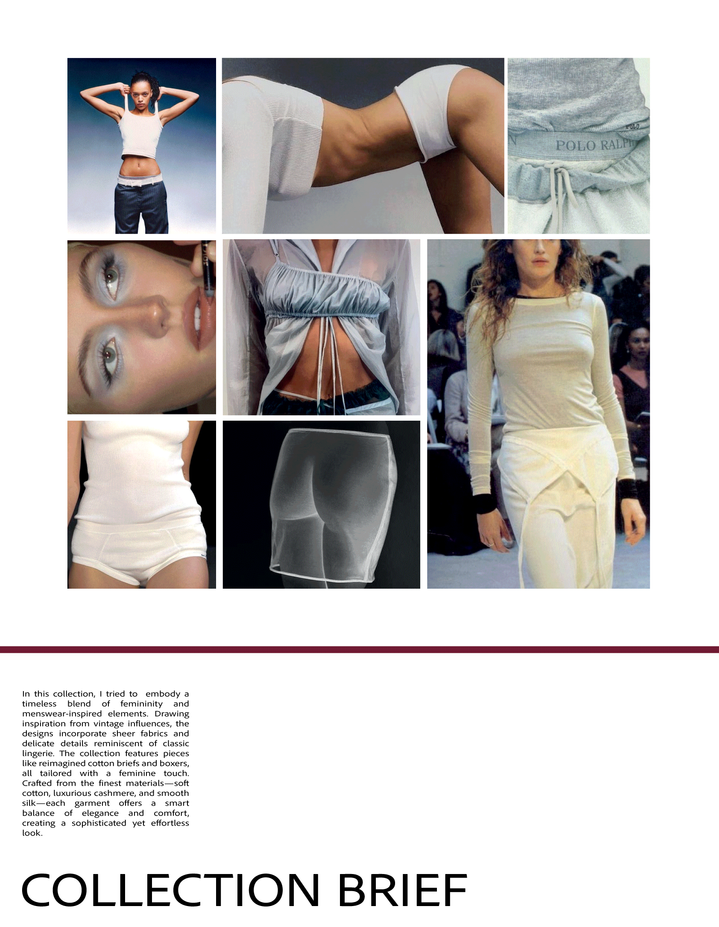 In this collection, I tried to embody a timeless blend of femininity and menswear-inspired elements. Drawing inspiration from vintage influences, the designs incorporate sheer fabrics and delicate details reminiscent of classic lingerie. The collection features pieces like reimagined cotton briefs and boxers, all tailored with a feminine touch.
